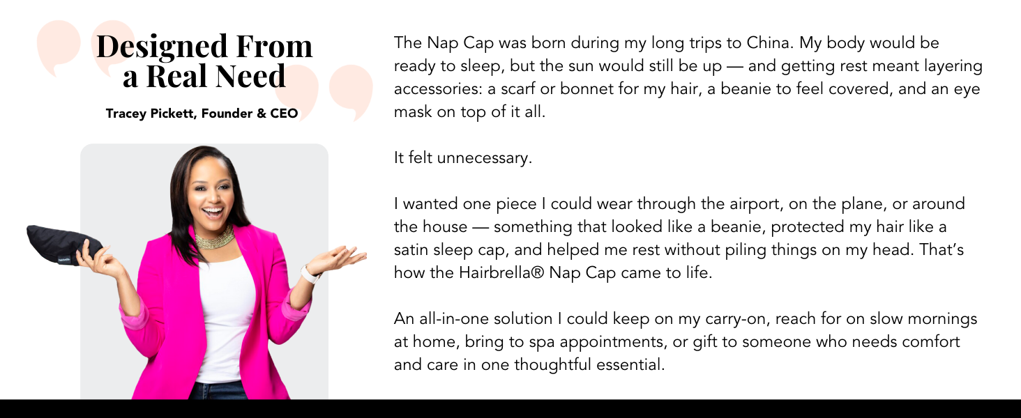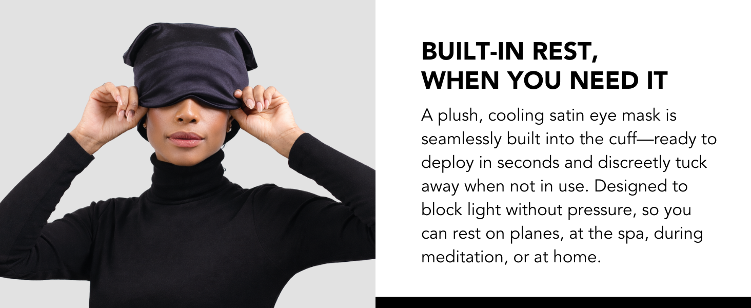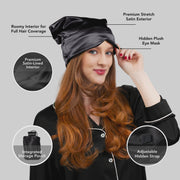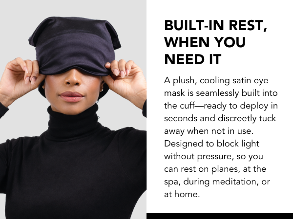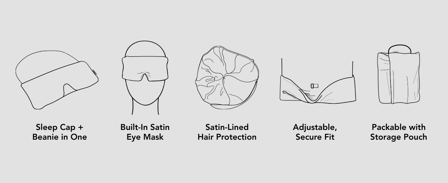 Meet the Hairbrella Nap Cap™—a satin-lined sleep cap with a built-in plush cooling satin eye mask, thoughtfully designed for sleep, travel, spa days, meditation, and everyday downtime.