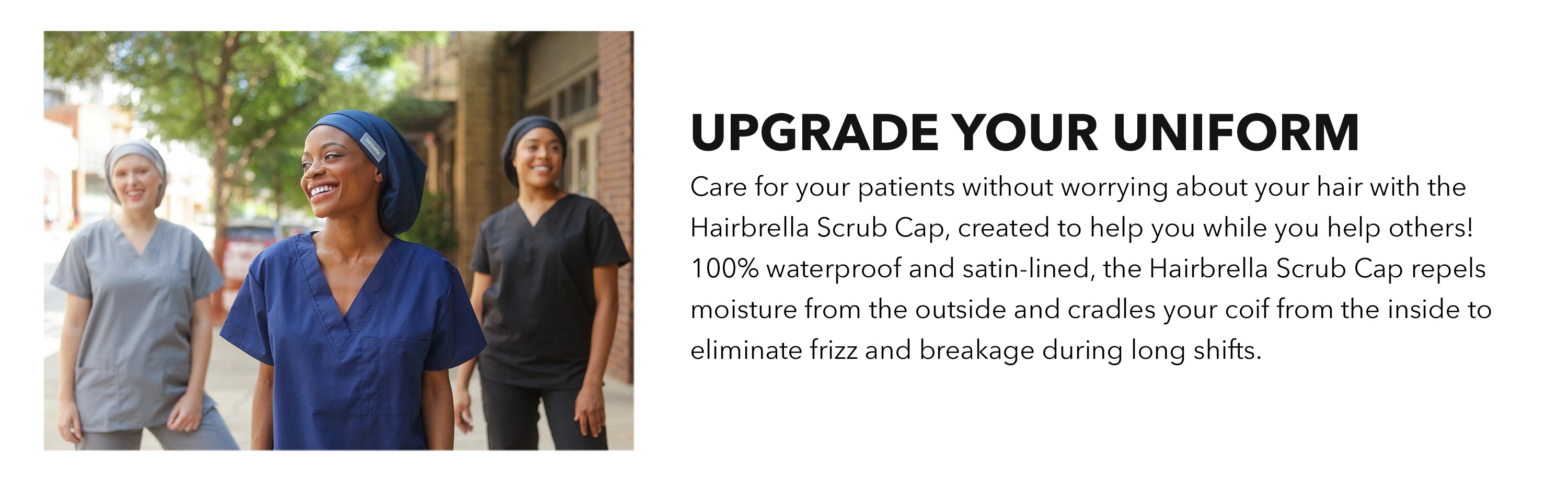 We've upgraded our scrub hats for nurses to include a moisture-absorbent sweatband along with our signature satin lining. The Hairbrella scrub cap is quick-drying and breathable.
