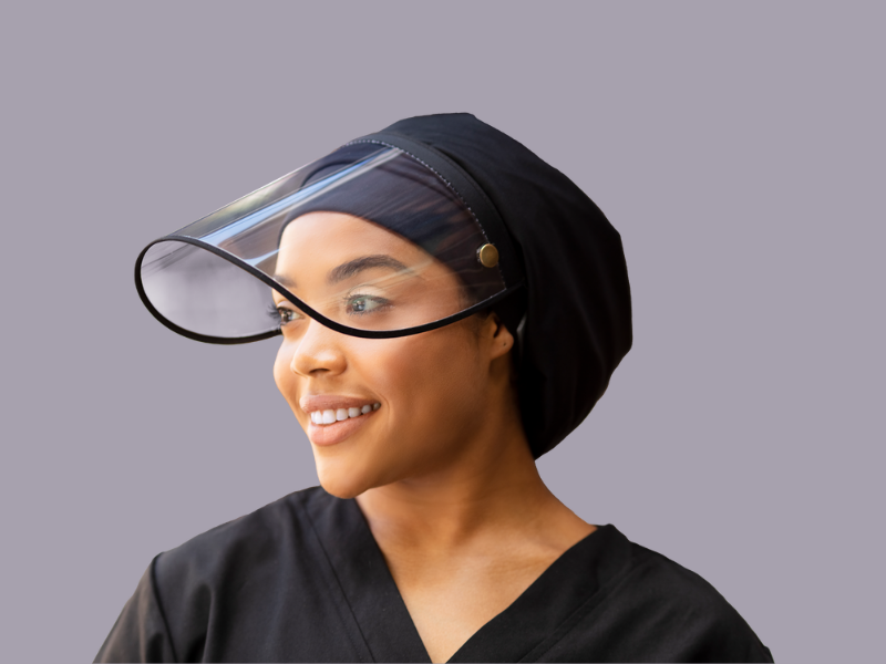 Upgrade your uniform with our satin-lined scrub caps featuring ear-relief buttons, sweatbands, and detachable and packable face shields.