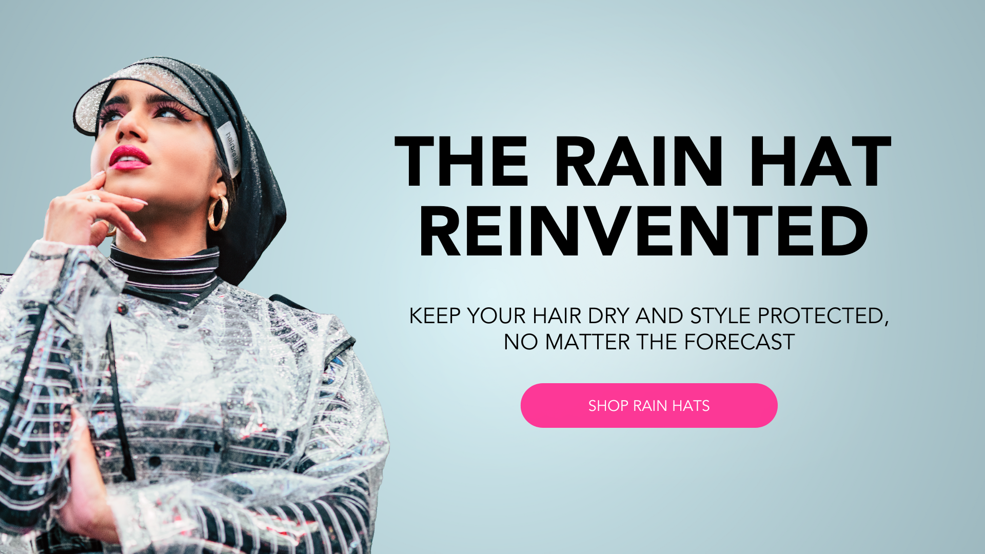 The visor-free rain hat with a waterproof shell and satin lining—keeps hair dry and styles flawless, rain or shine!