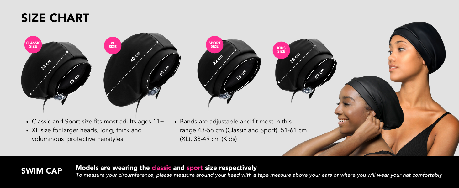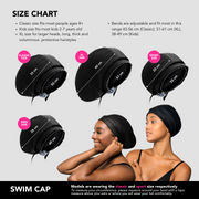 • Both Classic and Sport fit most adults (ages 11+) within a 43–56 cm head circumference. The Sport offers a slightly more streamlined shape for performance/lap swimmers.