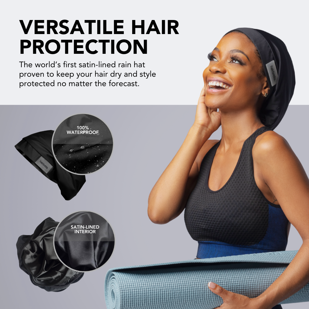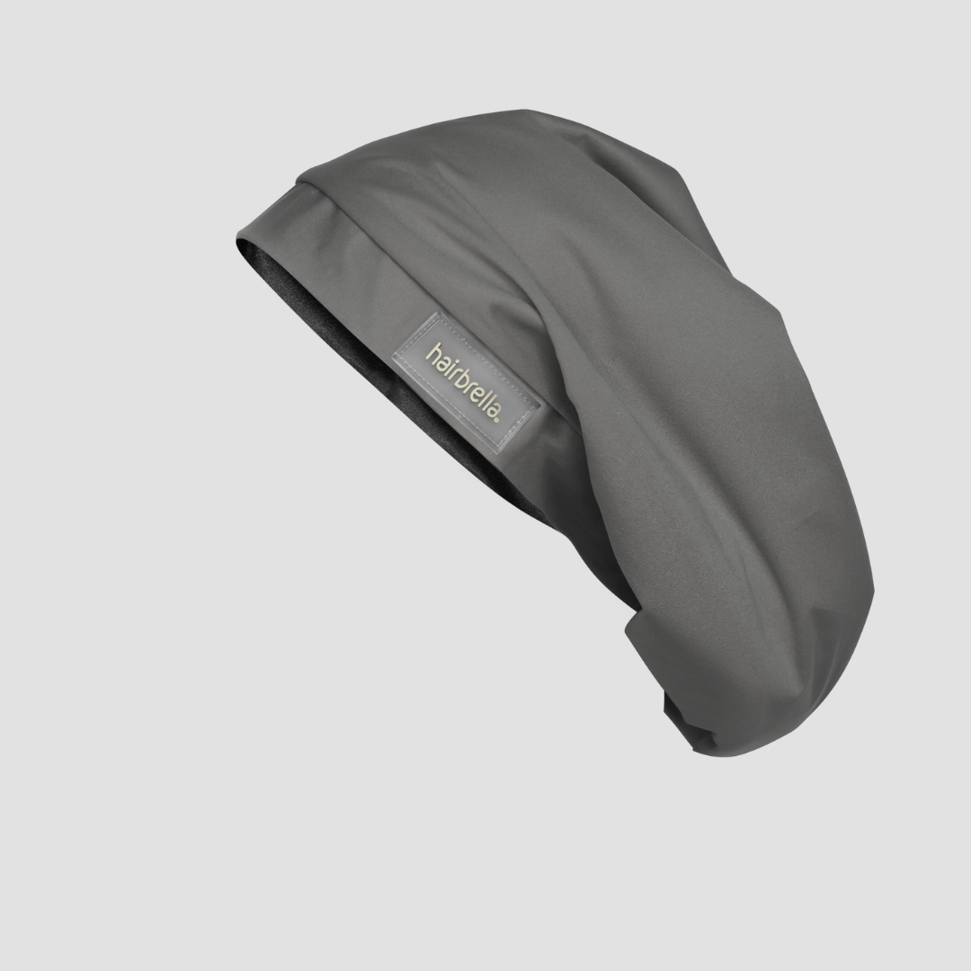 The Hairbrella Lite the visor-less version of the Classic Rain Hat featuring our 100% waterproof microfiber exterior and luxurious satin-lined interior guaranteed to keep your hair dry and style protected no matter the forecast!